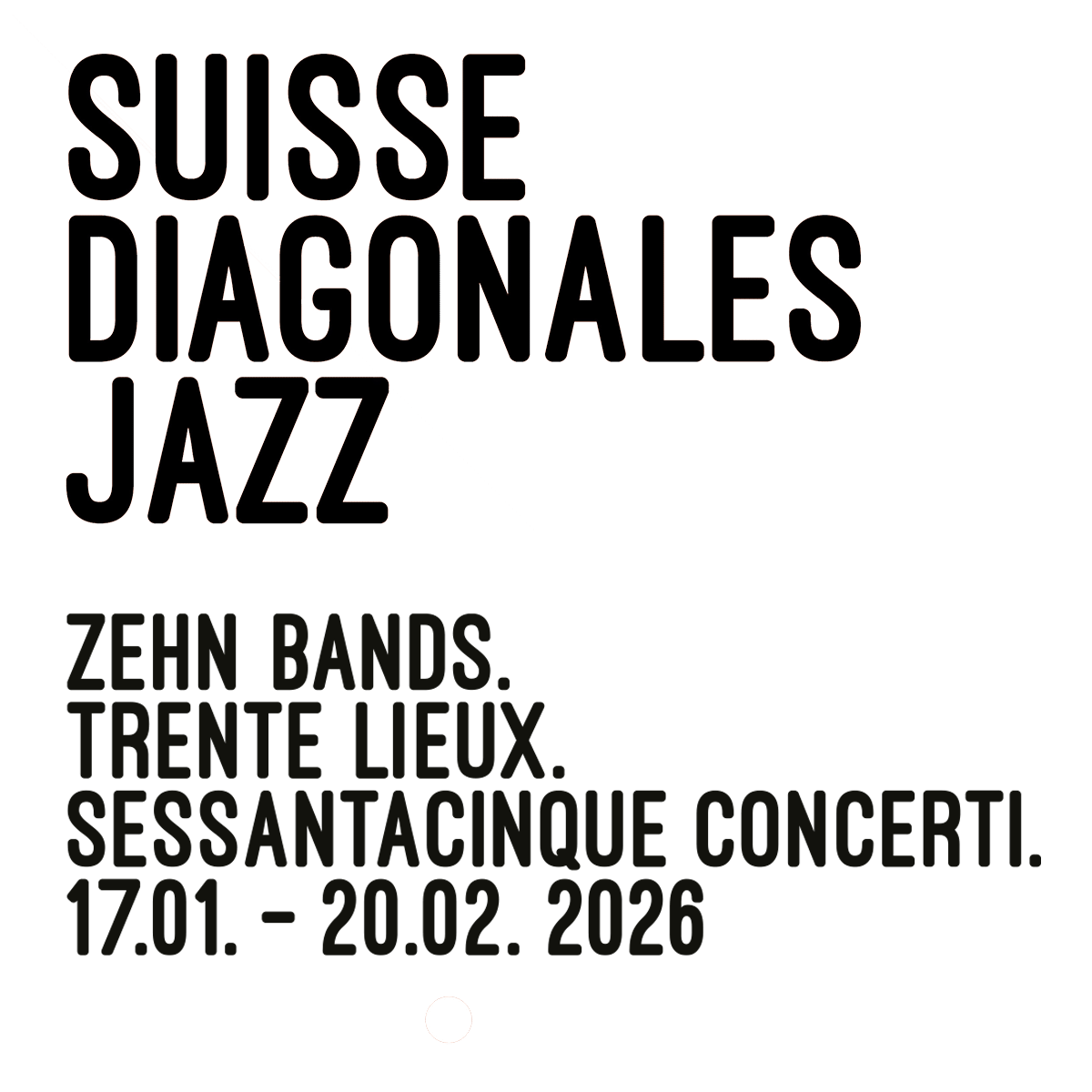 Alle zwei Jahre fördert der Verein Suisse Diagonales Jazz SDJ den jungen Schweizer Jazz mit einer Konzertreihe quer durchs Land. Im Januar und Februar 2026 spielen 10 aufstrebende Jazzformationen aus allen Sprachregionen der Schweiz total 65 Konzerte bei 30 Jazzveranstaltern in allen Winkeln des Landes.